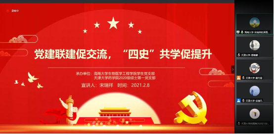 与天津大学药学院于2月8日晚7:30,以线上的方式共同举办《党建联建促交流,“四史”共学促提升》主题分享会。本次活动由博牛网