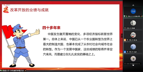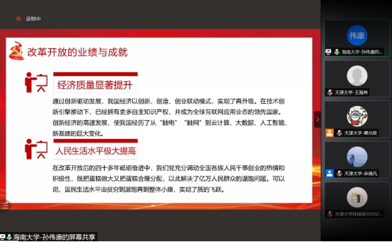 本次活动围绕“英雄、复兴、创新、信念”展开主题分享,由天大和海大的同学分组展示自己的学习成果。