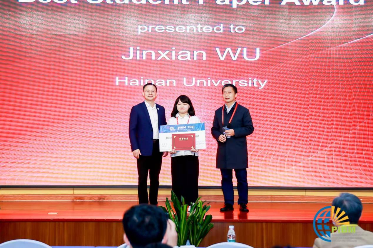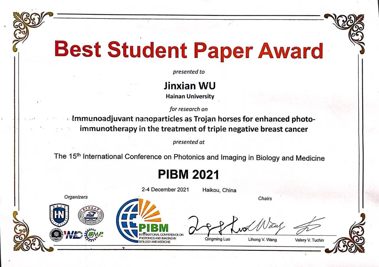 硕士研究生吴瑾娴(导师:周非凡)获此殊荣,大会共同主席海南大学校长骆清铭院士为其颁发证书。她以“Immunoadjuvant nanoparticles as Trojan horses for enhanced photo-immunotherapy in the treatment of triple negative breast cancer”为题目做了口头报告。