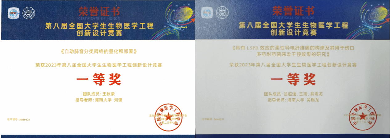 其中刘谦教授指导的《自动肺音分类网络的量化和部署》、吴锡龙教授指导的《具有 LSPR 效应的柔性导电纤维膜的构建及其用于伤口多药耐药菌感染干预效果的研究》均获得全国一等奖。