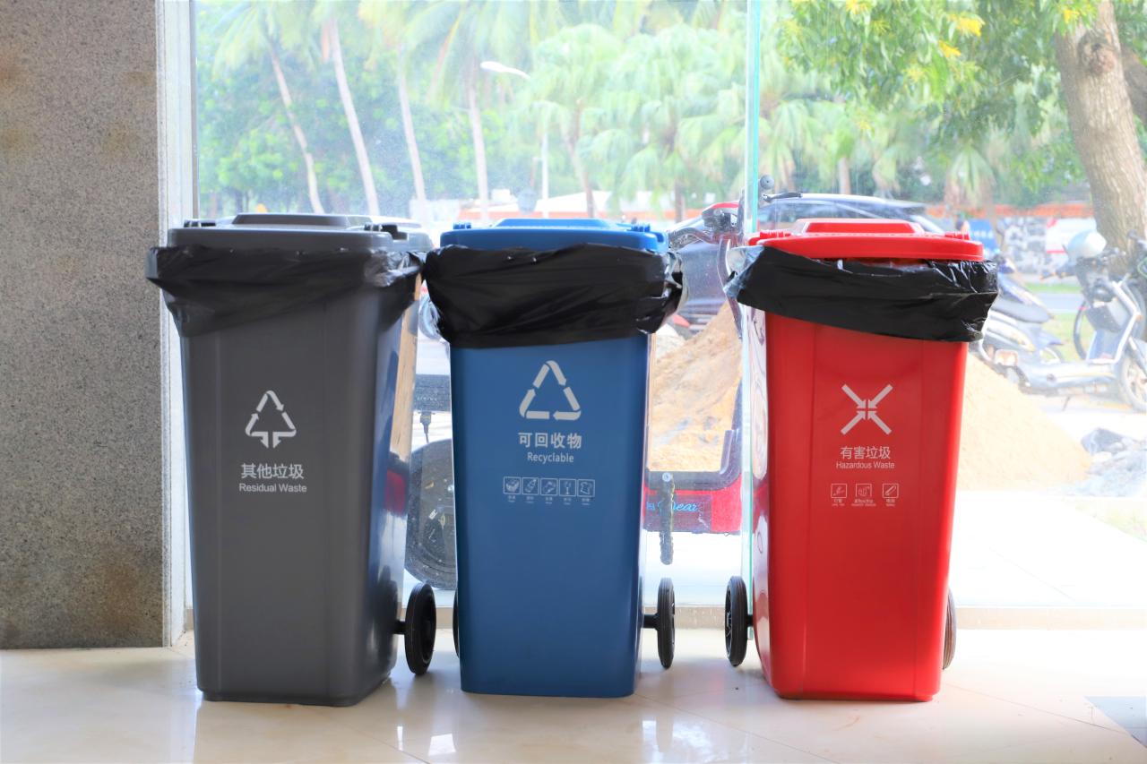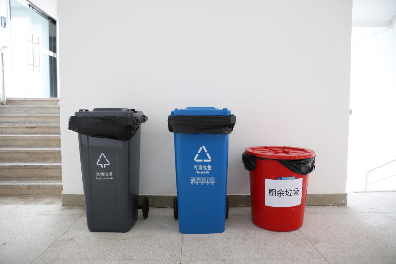 (二)各区域使用蓝色、灰色、红色来区分可回收垃圾、其他垃圾、有害垃圾、厨余垃圾,所有人员将垃圾按分类投放到相应的垃圾桶。