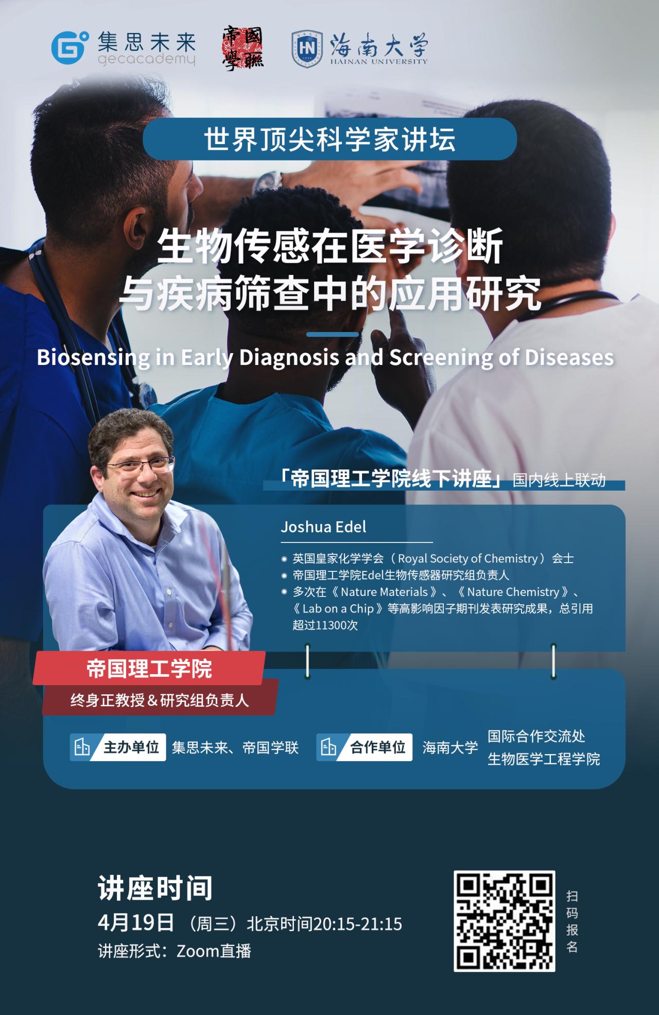嘉宾介绍:Joshua导师现任帝国理工学院化学系生物传感与分析科学终身正教授、东京理工学院客座教授,是英国皇家化学学会会员,欧洲研究理事会(ERC)巩固者奖获得者(奖励杰出独立科研人员)、欧洲研究理事会(ERC)启动基金获得者(奖励职业生涯早期杰出学者)。Joshua导师现已发表百余篇学术论文,受邀参加近百次学术演讲。他带领学生创立“Edel group”,研究领域涵盖化学、化学生物学、物理学和医学,致力于研究和开发灵敏度高、轻量化的新型传感器。