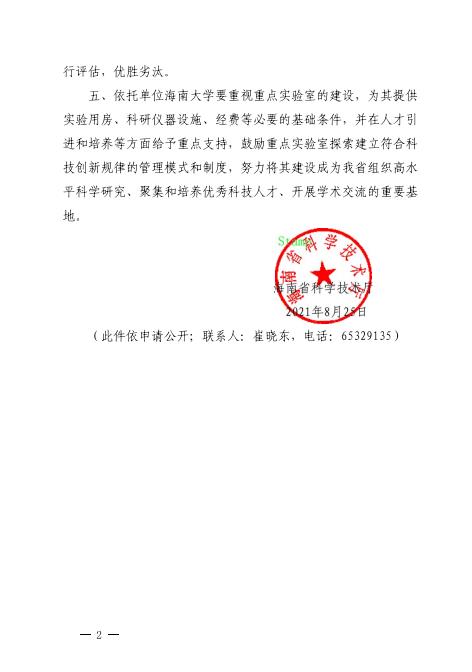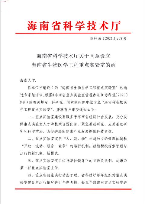 海南省科学技术厅关于同意设立海南省生物医学工程重点实验室的函