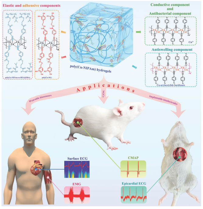 与相关课题组合作,开发了一种聚(Cu-芳基乙炔)与聚(N-异丙基丙烯酰胺)互穿网络水凝胶poly(Cu-NIPAm),该水凝胶以Cu-芳基炔化物为主链,呈现出优异的本征导电、抗溶胀、抗菌、生物相容性,并展示了其用于体表应力传感、肌电、体表心电,植入式心外膜心电图记录、以及以神经导管形式进行神经信号传导的优异性能和开发潜力。