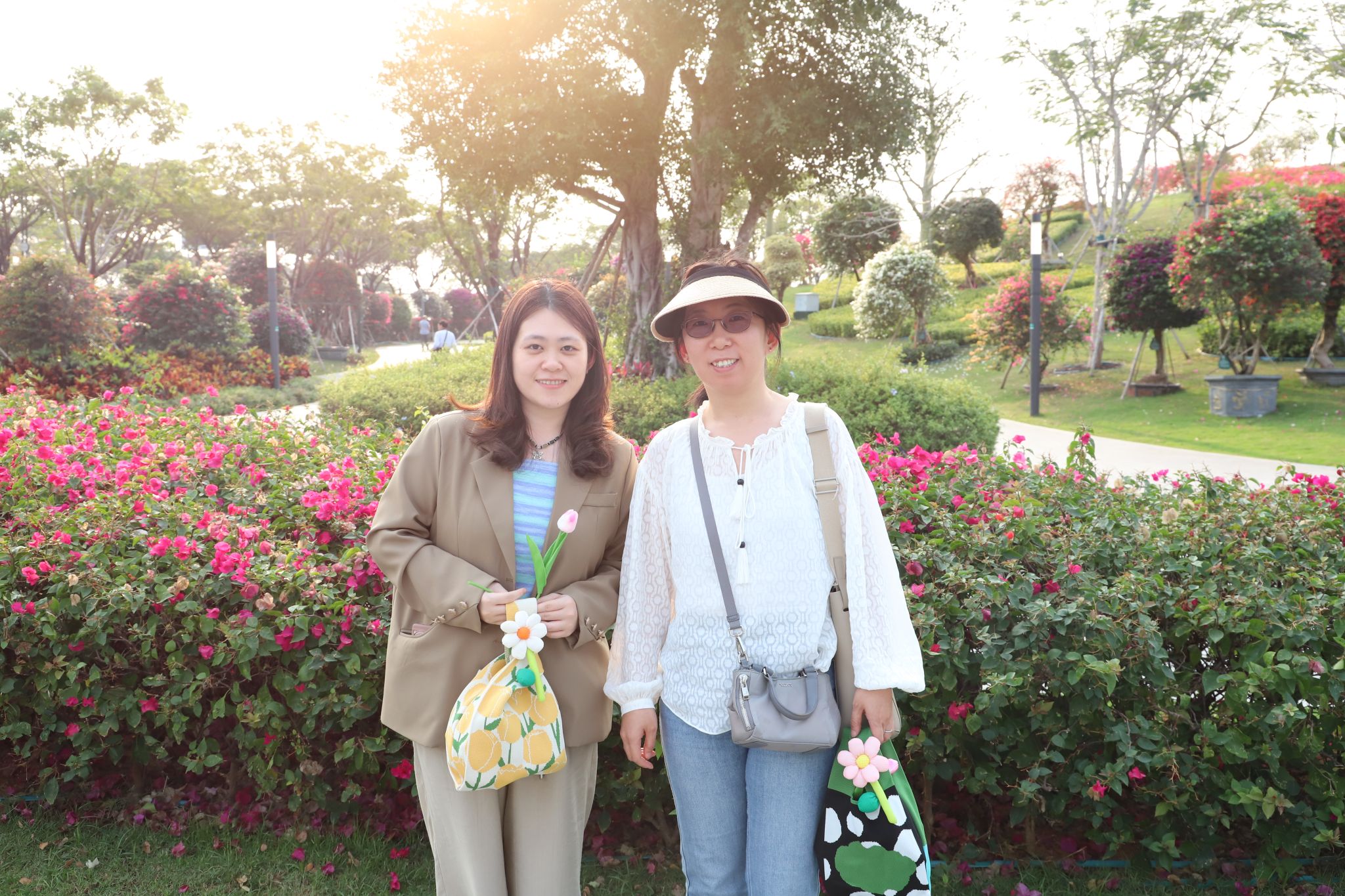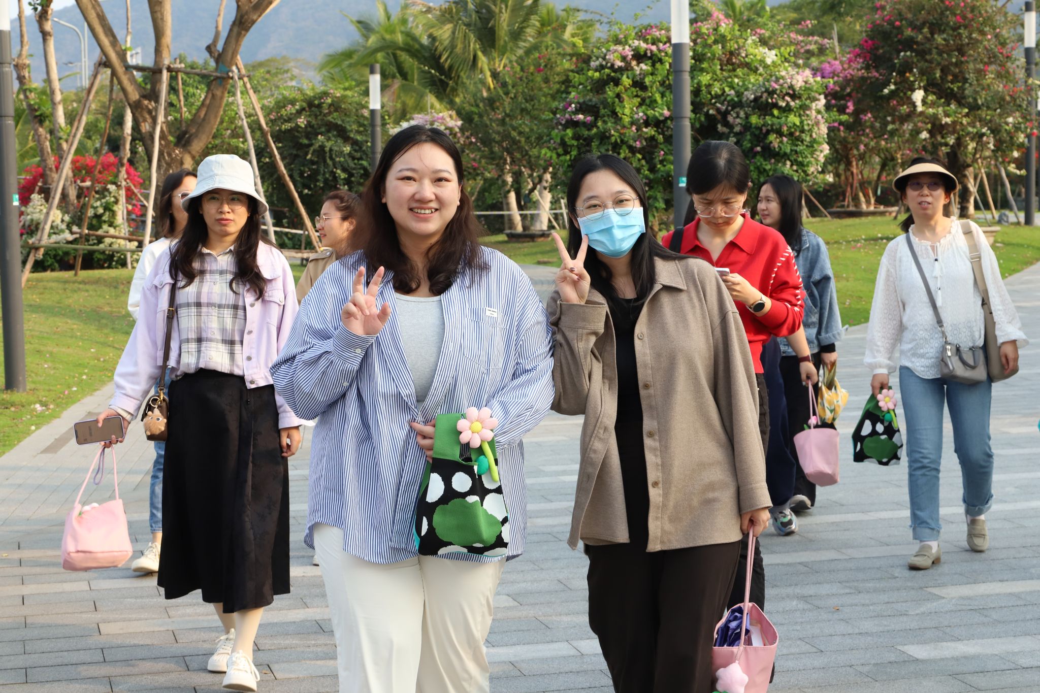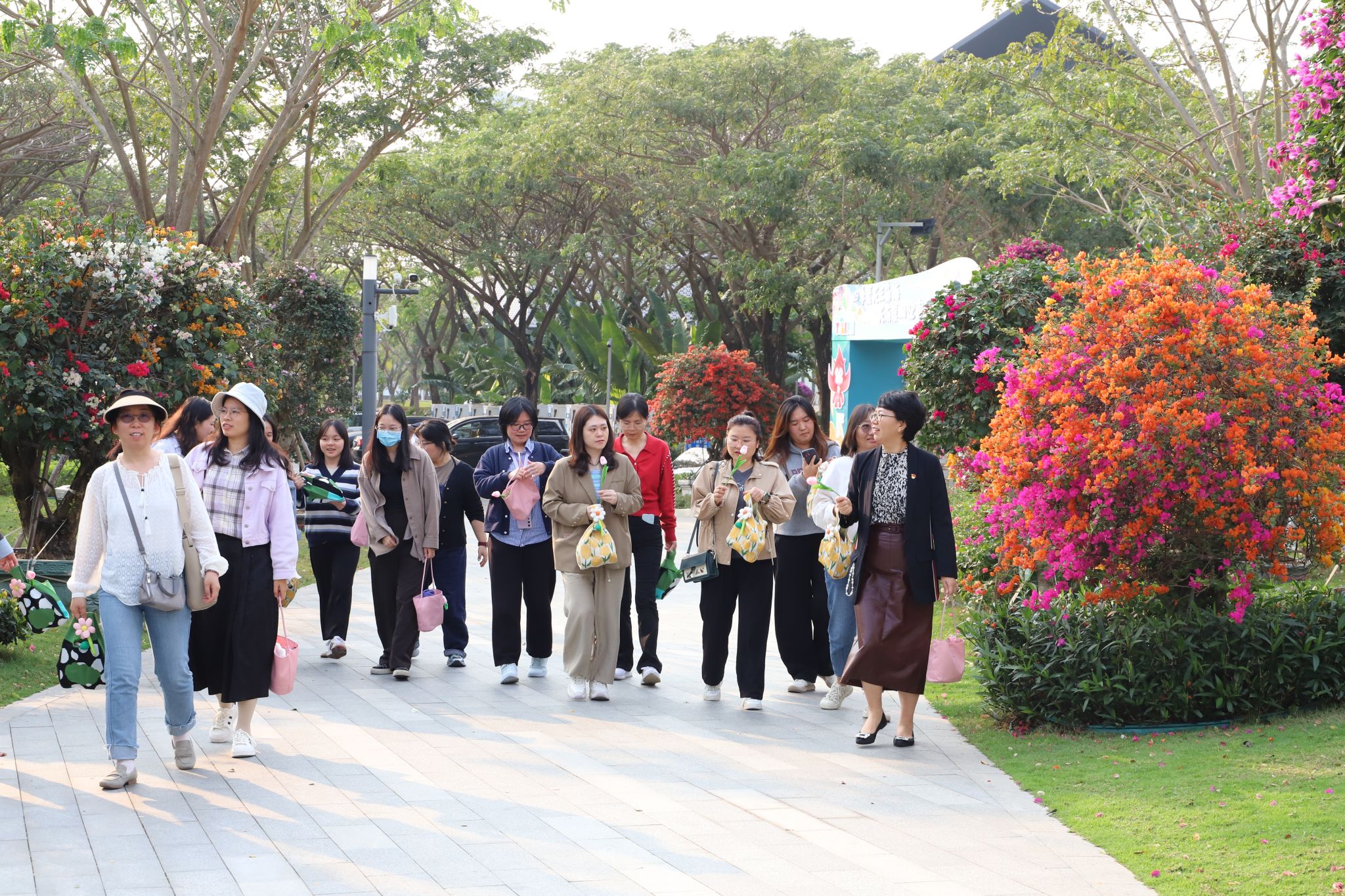 下午五点,学院女教职工们身着轻便运动装,齐聚三角梅公园门口,并领取了学院工会精心准备的节日礼物。随后,在院旗的引领下,女教职工们精神抖擞地开始了环公园徒步活动。漫步在三角梅盛开的公园小径上,大家三五成群,或驻足欣赏美景,或拍照留念,或畅聊生活趣事,欢声笑语此起彼伏,为春日的公园增添了一道亮丽的风景线。