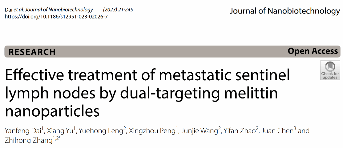 张智红教授团队的最新研究成果“Effective treatment of metastatic sentinel lymph nodes by dual-targeting melittin nanoparticles”在国际权威期刊《Journal of Nanobiotechnology》(中科院大类1区Top期刊,IF=10.2)上发表。研究团队发展了一种有效抑制乳腺癌前哨淋巴结转移的蜂毒肽脂质纳米探针,为肿瘤淋巴结转移的诊疗提供了潜在新途径。