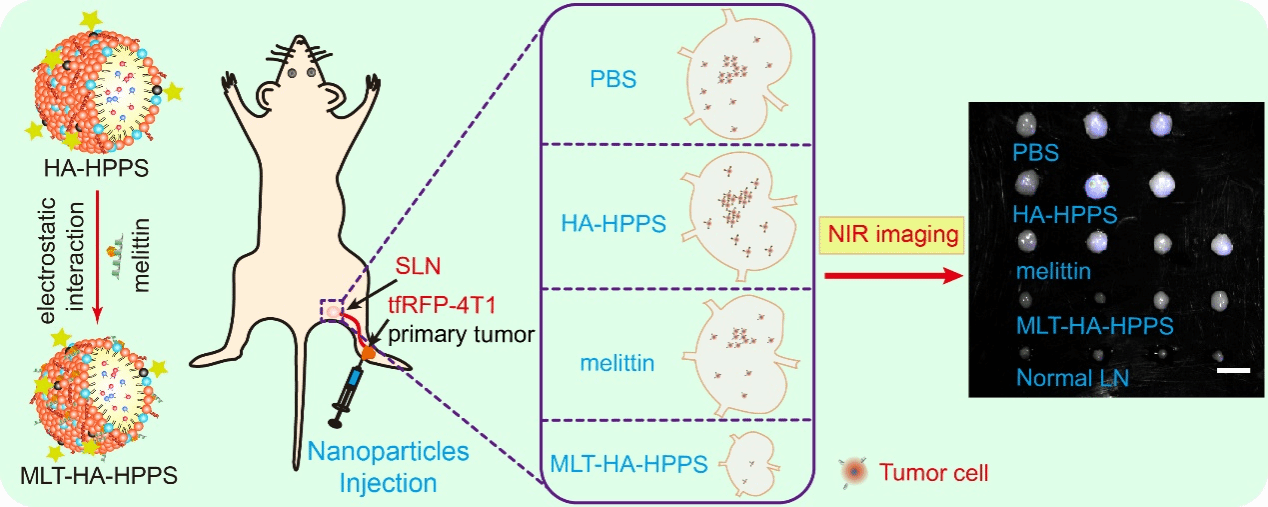 张智红教授课题组前期发展了一种双靶向乳腺癌细胞CD44和SR-B1受体的荧光/光声纳米探针HA-HPPS,通过结合光声显微成像可以准确地将肿瘤转移的前哨淋巴结与正常淋巴结和炎症性淋巴结进行区分,从而为有效鉴定肿瘤前哨淋巴结的转移状态提供了一种有效的工具。基于此,团队研究人员进一步通过静电效应将具有肿瘤杀伤能力的蜂毒肽(melittin)装载到HA-HPPS上,发展了一种双靶向乳腺癌细胞的蜂毒肽脂质纳米颗粒MLT-HA-HPPS,该纳米颗粒即能有效迁移到肿瘤前哨淋巴结,又能靶向淋巴结中转移的肿瘤细胞,有效地抑制了乳腺癌肿瘤生长及其前哨淋巴结转移,从而为肿瘤淋巴结转移的诊疗提供了有应用潜力的新工具。该研究获得国家自然科学青年基金(32201131)、中国博士后科学基金(2022M710990)、海南大学科研基金(KYQD(ZR)20078)、111项目(D22022)和武汉光电国家研究中心创新基金资助。海南大学张智红教授为文章的通讯作者,课题组博士后戴艳锋为文章第一作者,海南大学余祥教授、彭星舟副教授,华中科技大学武汉光电国家研究中心博士后王俊杰、研究生赵一帆和冷月红,以及加拿大多伦多大学的陈涓博士共同参与了相关工作。