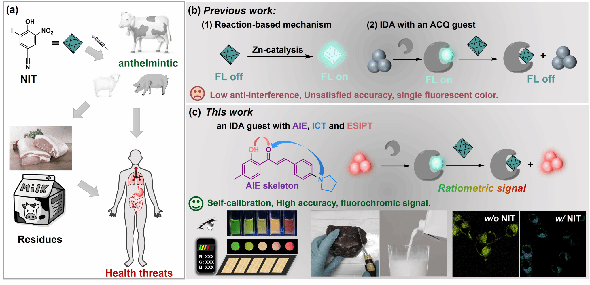 朱明强团队研发了一个能快速检测食品样品中兽药硝碘酚腈(NIT)的比率型荧光探针,作者利用探针还实现双通道细胞内NIT成像。此项研究成果以“A ratiometric fluorescent indicator-displacement assay for on-site determination and intracellular imaging of nitroxinil”为题发表于国际期刊《Food Chemistry》(中科院一区,IF: 8.8)。