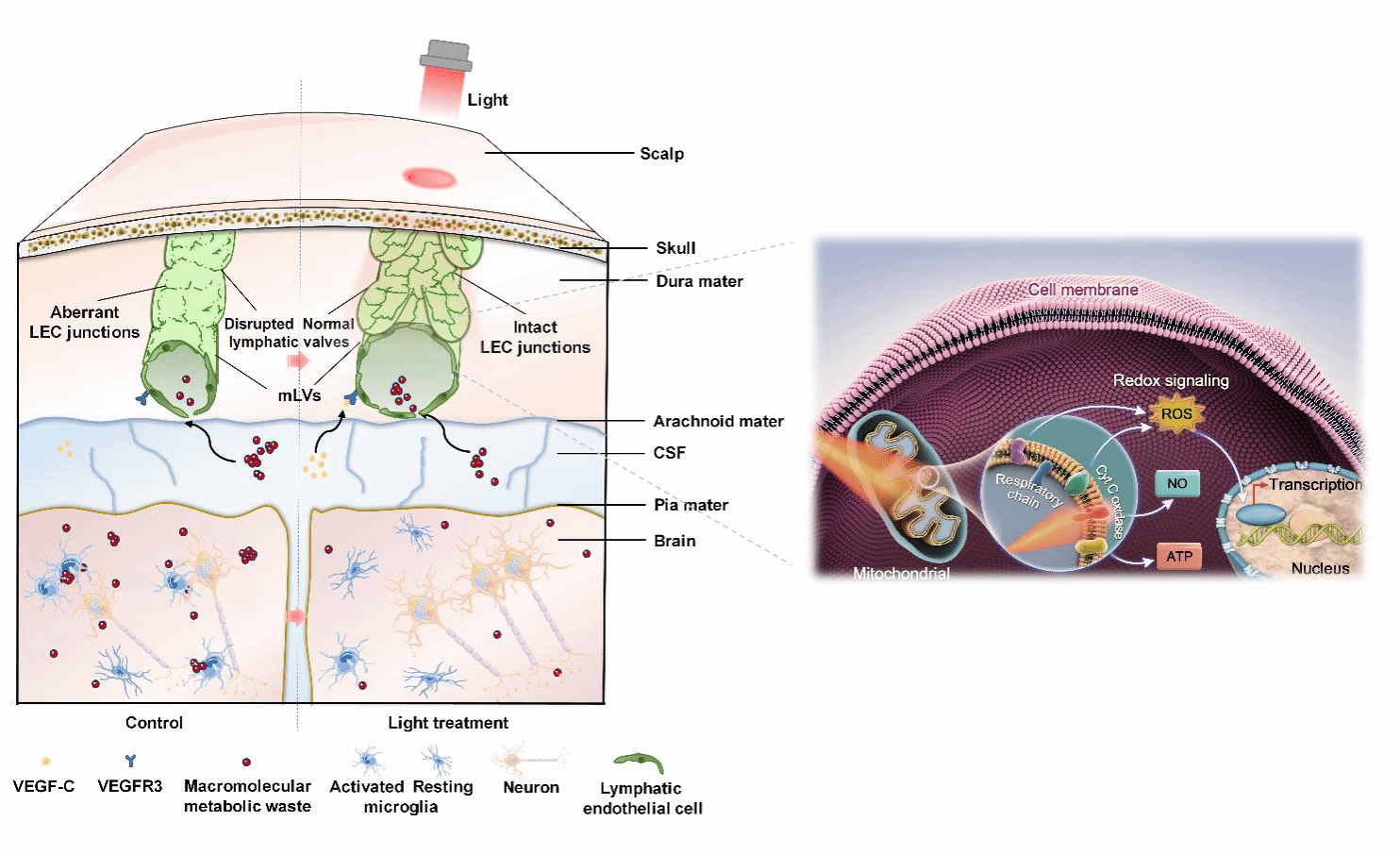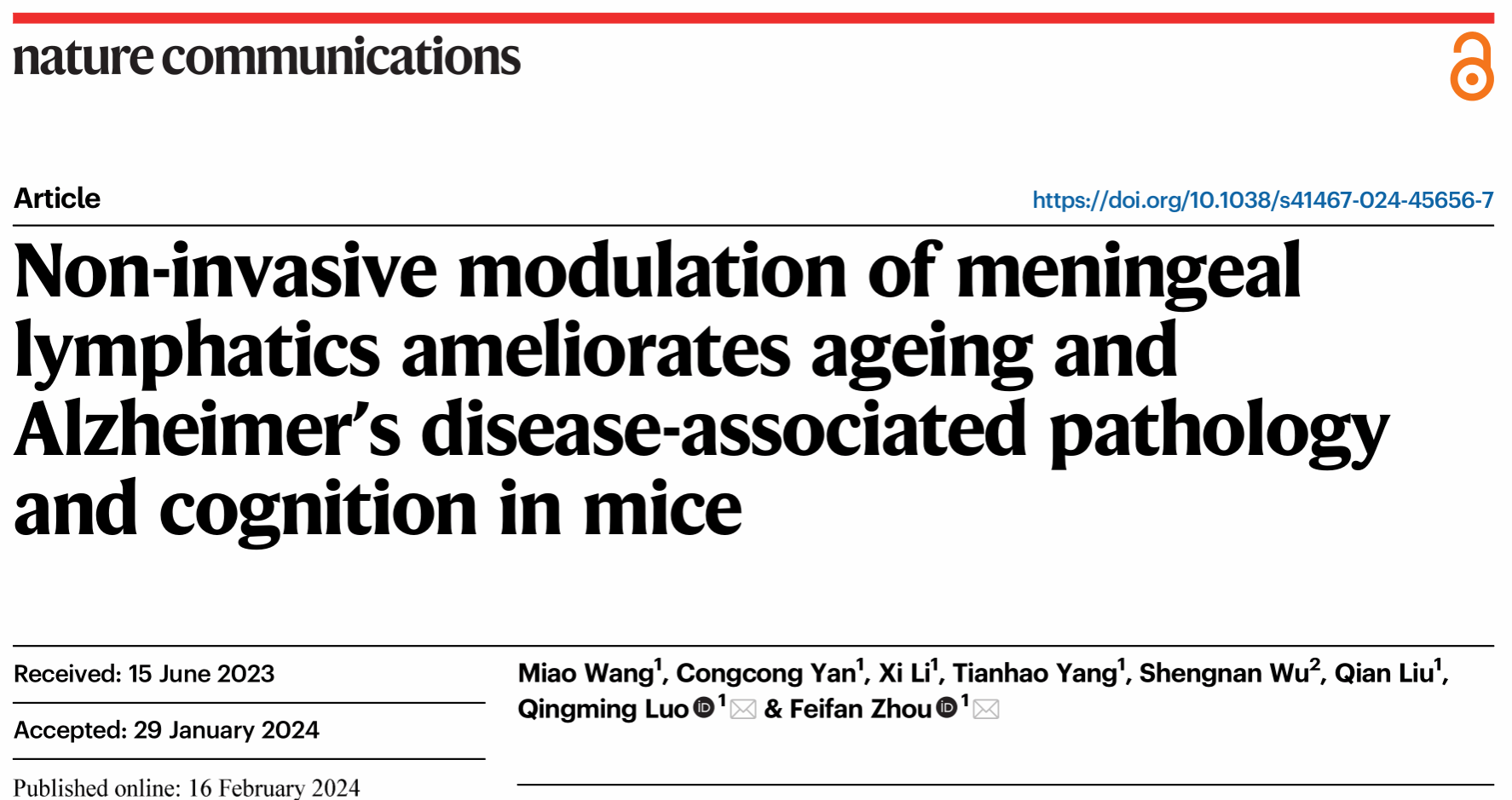周非凡教授团队论文Non-invasive modulation of meningeal lymphatics ameliorates ageing and Alzheimer's disease-associated pathology and cognition in mice。该研究利用近红外激光(808 nm)对衰老及阿尔茨海默病(Alzheimer's disease, AD)小鼠实施无接触经颅光疗,显著提升脑膜淋巴系统引流功能,最终实现小鼠的病理缓解及认知提升。