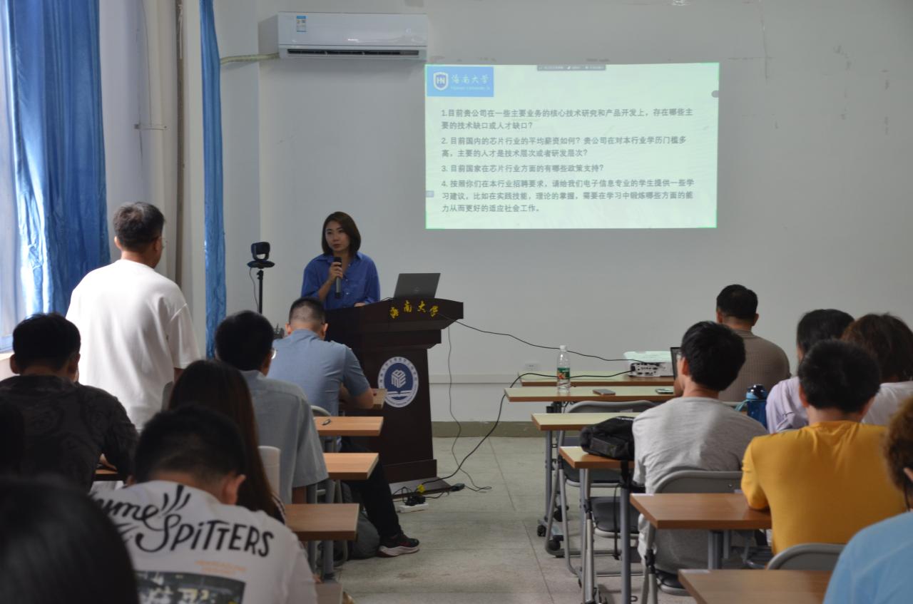 6月9日芯原微电子(海南)公司(以下简称芯原)受邀在学院314会议室举办了生产实习课程。2020级全体本科生参加课程,课程由芯原微电子(海南)公司人事部经理云玲主持,采取线上线下相结合的教学形式。